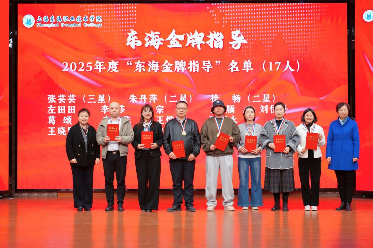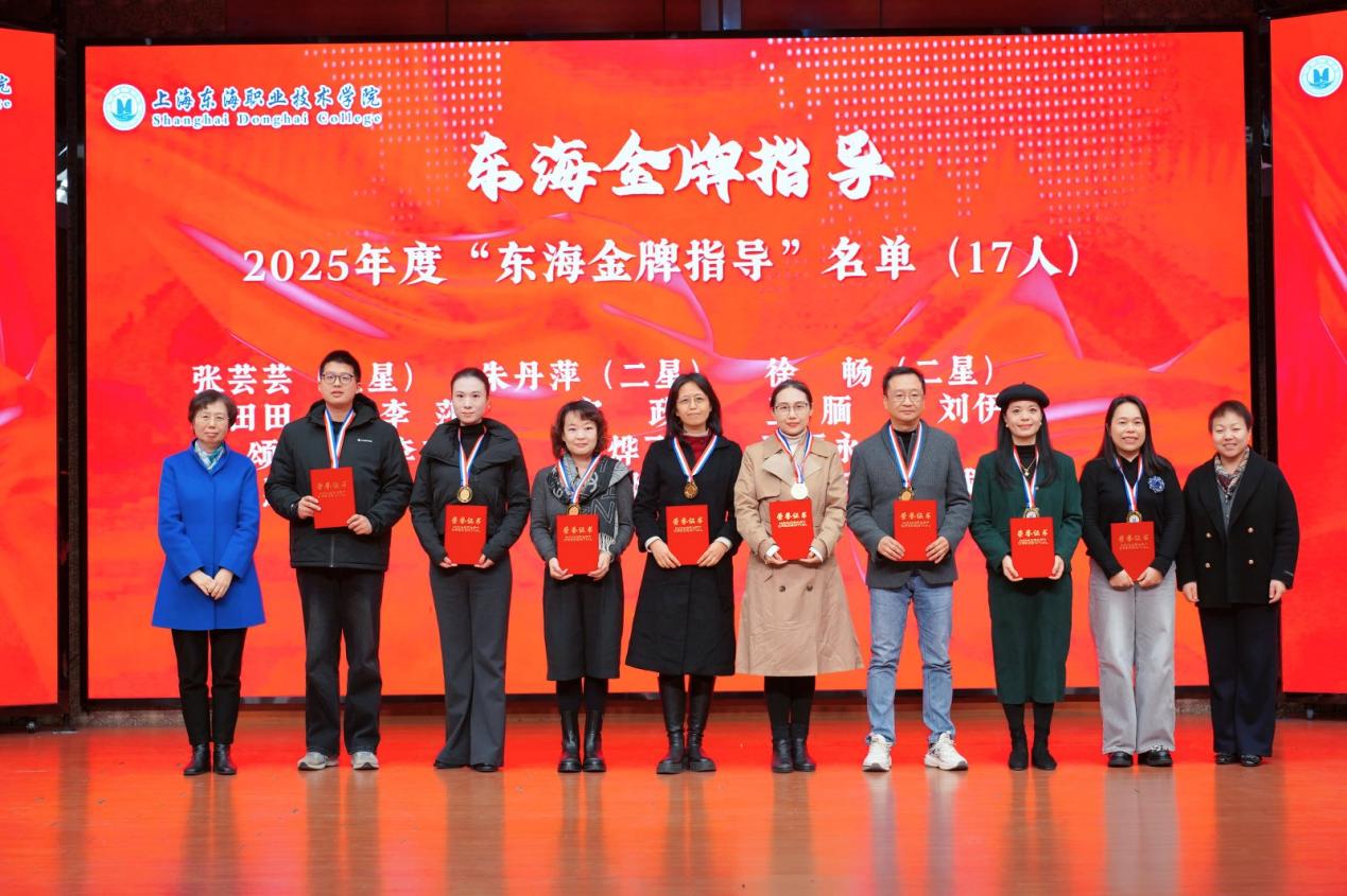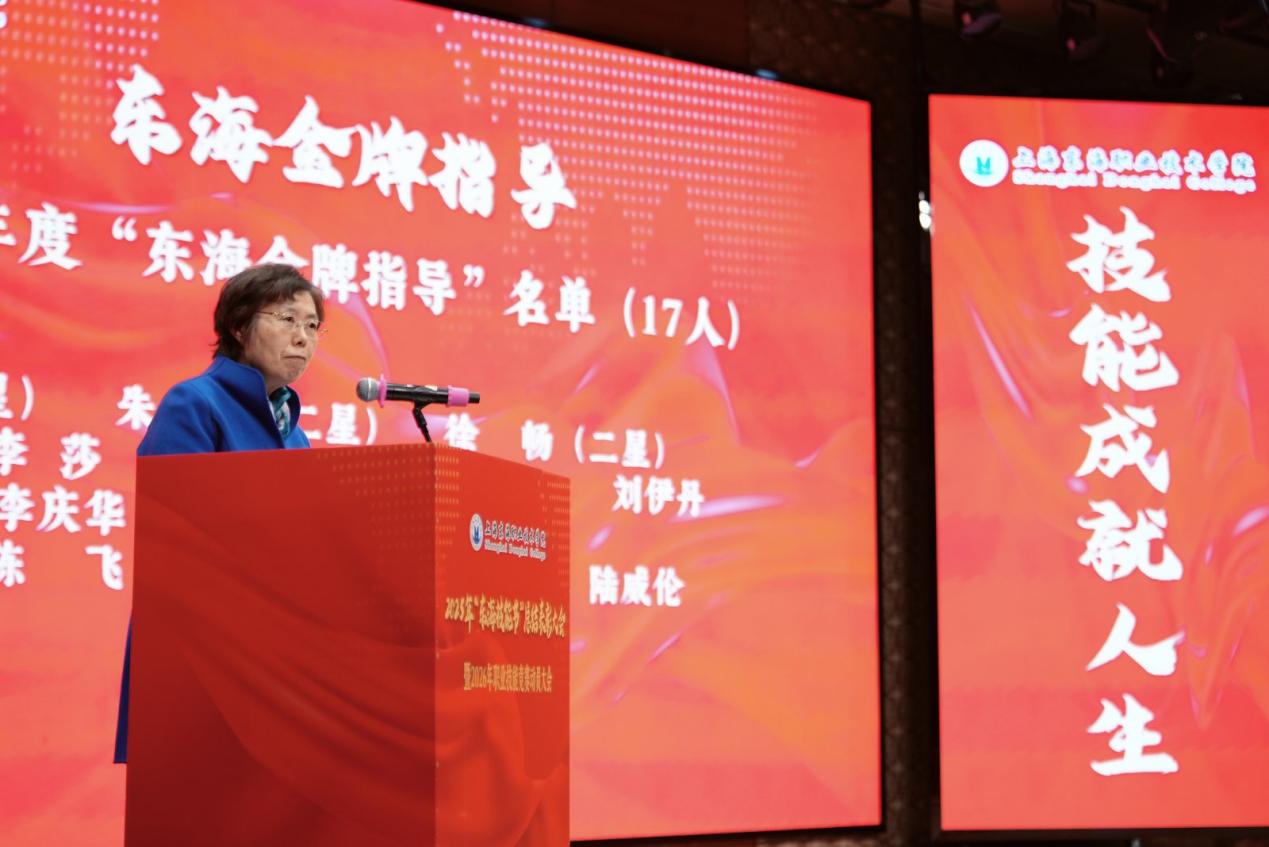 随后,校党委书记曹蓉蓉宣读了表彰决定。2025年,学校共设立四大类技能大赛荣誉称号,获奖师生达305人次,包括“东海金牌指导”17人、“东海优秀指导”7人、“东海技能之星”50人及“东海技术能手”231人。校党政领导与二级学院院长共同为获奖师生颁发奖牌、奖杯及荣誉证书。